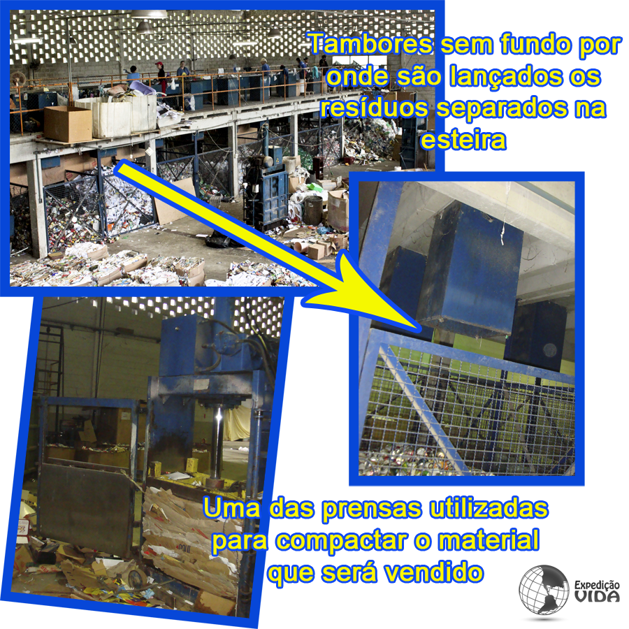 A esteira fica num local elevado para que o material apanhado seja lançado em um “tambor” sem fundo, que permite que os resíduos caiam em um grande cercado. Depois disso, são prensados e comercializados diretamente com indústrias interessadas. O material que não foi selecionado na esteira é descartado juntamente com os demais rejeitos e vai para o aterro de Brusque. Uma boa parte desses resíduos ainda poderia ser reciclada, mas não passa novamente na esteira pela falta de tempo, pois há caminhões descarregando sacos de resíduos a toda hora.