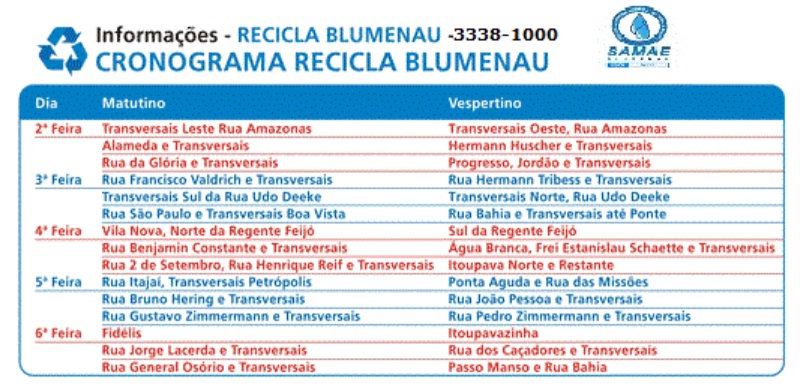 Blumenauenses, vocês sabem que o nosso lixo é coletado de duas formas diferentes, né? O lixo que não separamos como reciclável vai para o aterro sanitário de Brusque e o que separamos para reciclar é coletado pelos caminhões da coleta seletiva. A coleta dos reciclados, na verdade, é uma parceria firmada entre a Prefeitura, por meio do Serviço Autônomo Municipal de Água e Esgoto (SAMAE), e a Associação dos Trabalhadores Coletores de Resíduos Recicláveis de Blumenau (Reciblu). Essa parceria resultou em um projeto denominado “Recicla Blumenau”. Desde 2005, o SAMAE realiza a coleta seletiva dos resíduos e a Reciblu é responsável pelo processamento e comercialização dos materiais recicláveis.