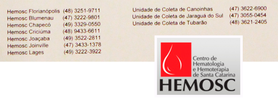 O HEMOSC é o Centro de Hematologia e Hemoterapia de Santa Catarina. Mais abaixo estão os telefones dos HEMOSC de Santa Catarina e o web site, onde você pode ler mais a respeito da doação de medula. Você pode clicar na imagem para visualizá-la melhor!