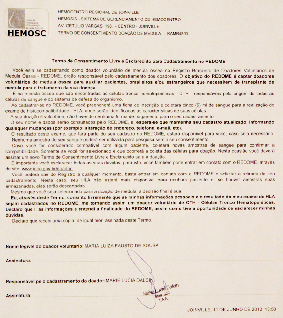 Infelizmente, tem coisas que só começamos a pensar quando a vida apronta conosco e joga a situação bem na nossa frente. Você já pensou em se cadastrar no banco de doadores de medula? Pois é, eu nunca tinha pensado… E não foi por má vontade não, simplesmente nunca tinha parado pra pensar nisso. Até que este ano, minha amada tia foi diagnosticada com leucemia. Nenhum dos quatro irmãos, que teriam maior chance de compatibilidade, foram compatíveis. E é aí que entra o banco de doadores de medula! Semana passada, minha mãe e eu fomos atrás das informações para saber como funciona e nos cadastramos. Gente, é tão fácil… Você tem apenas que ir até o Hemocentro ou Banco de Sangue da sua cidade (no caso de nós catarinenses, o HEMOSC), assinar um termo de cadastro (você pode visualizá-lo logo abaixo) e vão retirar de você 5ml de sangue (igual a um exame de sangue) para fazer a análise genética para o seu cadastro. O banco é mundial. Se algum dia alguém que esteja precisando do transplante for compatível com você, então você é chamado para a doação. A retirada da medula acontece por cirurgia com anestesia geral ou peridural, o que faz muitas pessoas desistirem da doação. Mas vamos combinar, isso não é nada diante do fato de que você pode ajudar a salvar uma vida! Já pensou? Poder salvar uma criança? Ou a mãe de alguém, uma irmã, um marido, uma tia… Sinceramente, desde que me cadastrei fico desejando ser chamada! De que vale estar nesse mundo tendo uma vida maravilhosa se não pudermos contribuir para a felicidade das outras pessoas também, não é? Se você também é adepto desse pensamento, tá aí uma boa forma de por em prática a solidariedade!